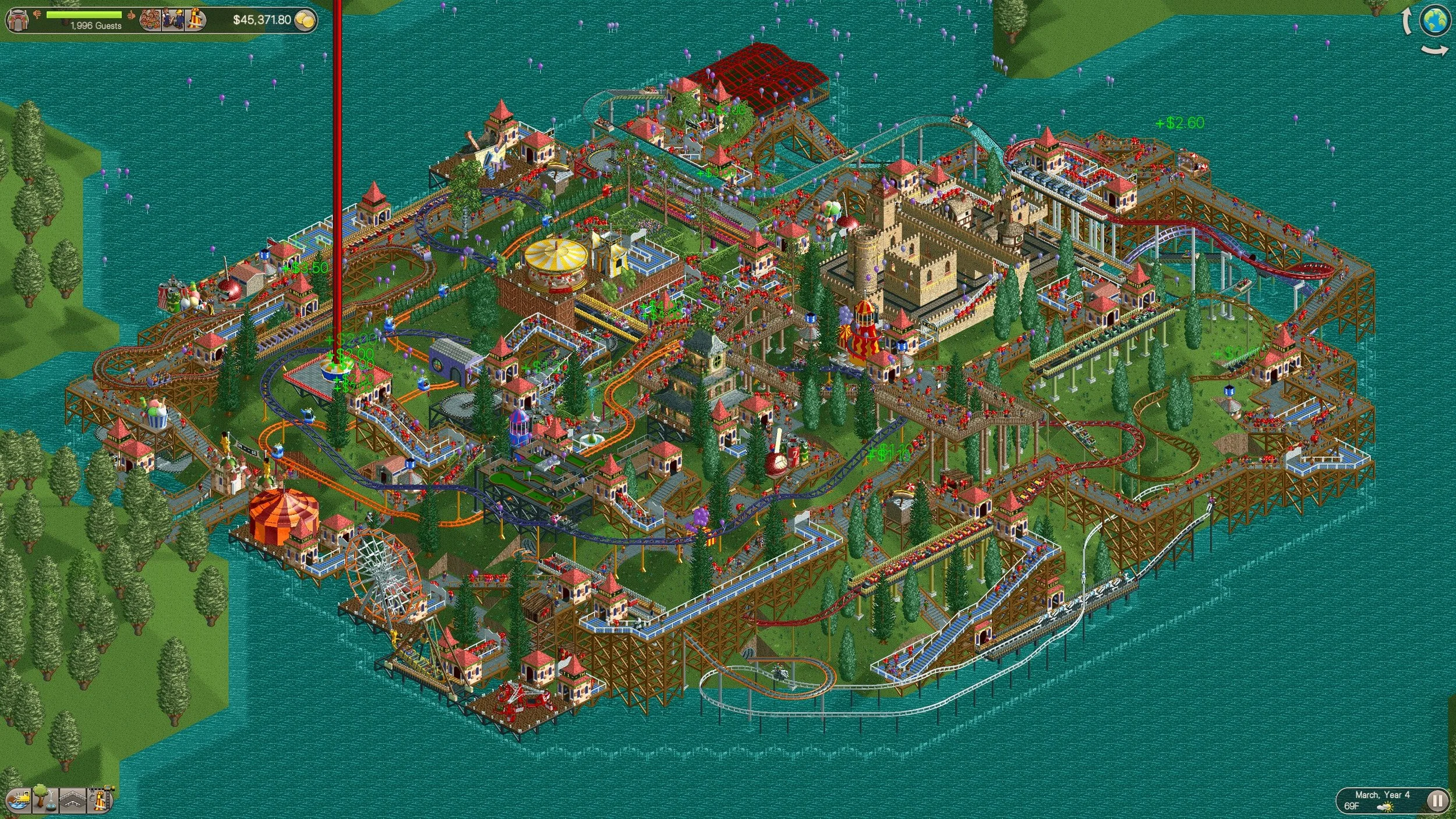 Simply put, it’s some of the earliest memories of gaming I have left. I still think about the times as a lad booting this up on my first Windows 98 PC at my Grandpa’s house, faffing about, placing nonsensical paths and ride track pieces not knowing a damn thing about how to actually construct a functional theme park. It wasn’t until I got a home PC and my mom played around with it, that I started to slowly understand what to do. How to actually construct a working ride, place down stalls for basic needs, a mechanic or two to make sure rides don’t kill anybody, a handyman or 40 to keep the park nice and tidy. But even still, it wasn’t until I was well in my 20’s that i could pore through the fine details. Becoming one with capitalism. Yes, let’s in fact charge for bathrooms, find the threshold in which guests will pay for a 3 second ride, charge 20 dollars more for an umbrella when it rains, extract every last cent outta these peeps, we’ve got a goal to hit. I’m no Marcel Vos or the many fine folks who play this for a living. But let me tell you, I could turn any park, big or small, into as profitable as Disneyland.